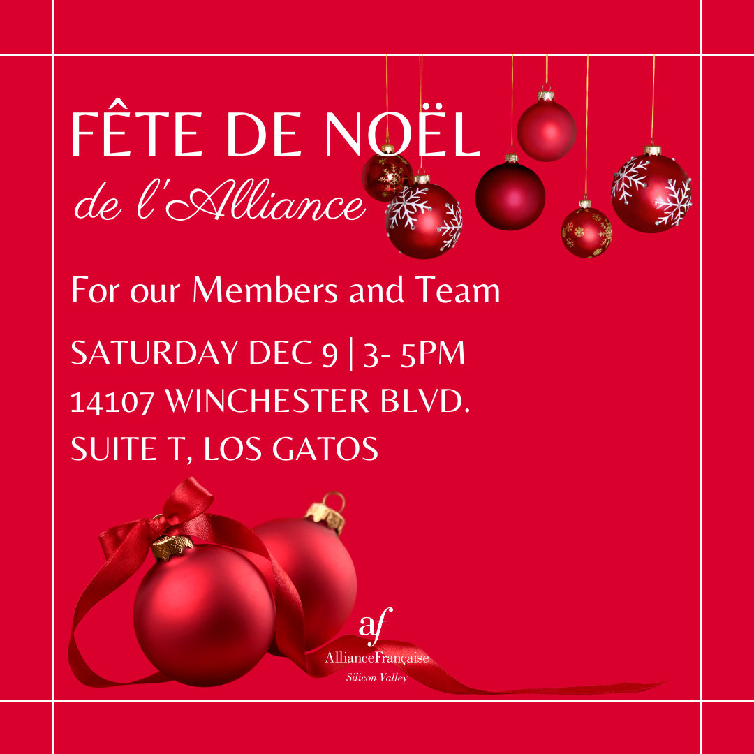 Alliance Française Silicon Valley invites all its members to a Holiday Party on Saturday December 9, 2023 from 3pm to 5pm.