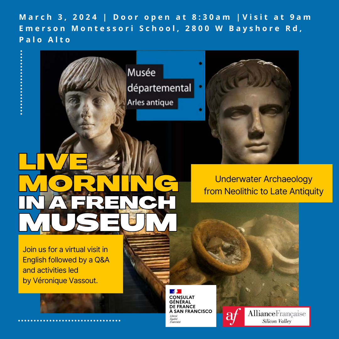 Join us on a Live-Guided Tour led by the esteemed cultural mediator, Camille Lavenu, from the comfort of The Emerson Montessori School in Palo Alto on March 3, 2023. Delve into the maritime heritage and vibrant port life as we unveil cutting-edge underwater archaeological discoveries and exhibition of artifacts ranging from the Neolithic era to Late Antiquity. Explore the transformative impact of Romanization on southern Gaul, tracing the development of communication networks and marveling at the enduring monuments that grace the region to this day.