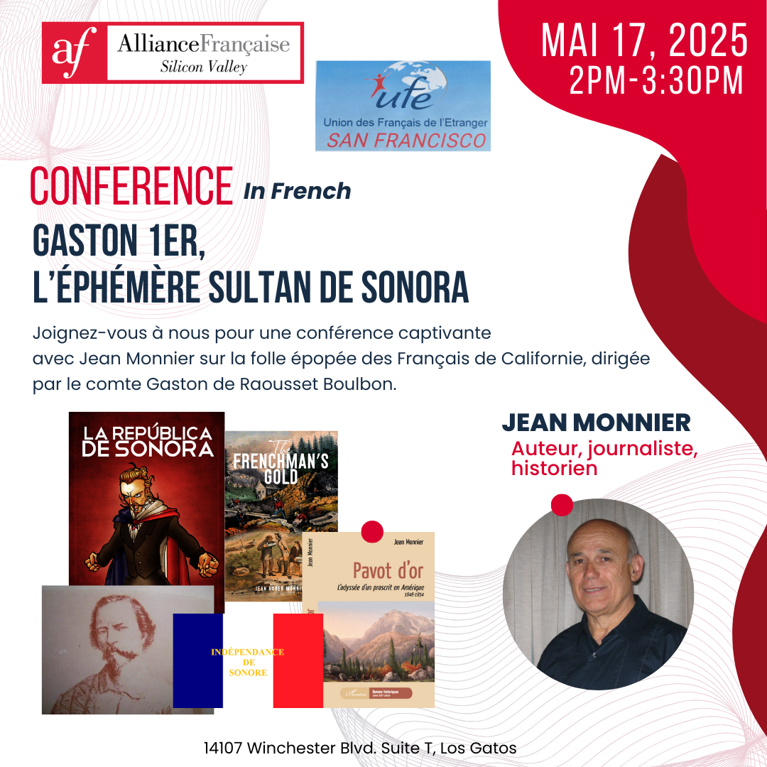 Nous sommes ravis de vous inviter à une conférence spéciale sur la folle épopée des Français de Californie, dirigée par le comte Gaston de Raousset Boulbon. De 1852 à 1854, ces aventuriers se lancèrent audacieusement à la conquête de l'état de Sonora au nord du Mexique. Découvrez comment les déchus de la ruée vers l’or donnèrent un deuxième souffle à leurs rêves de fortune en se jetant à l’aventure vers un nouvel El Dorado encore plus fou.