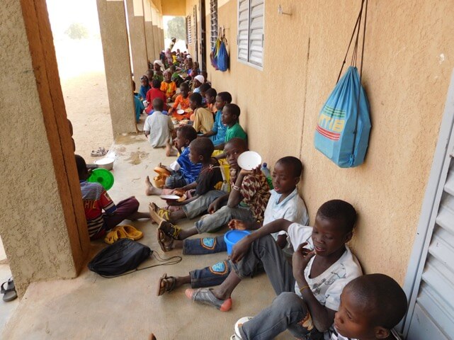 Le réfectoire ! A midi, on s'assied par terre et on mange son bol de riz, le dos appuyé contre le mur de la salle de classe.