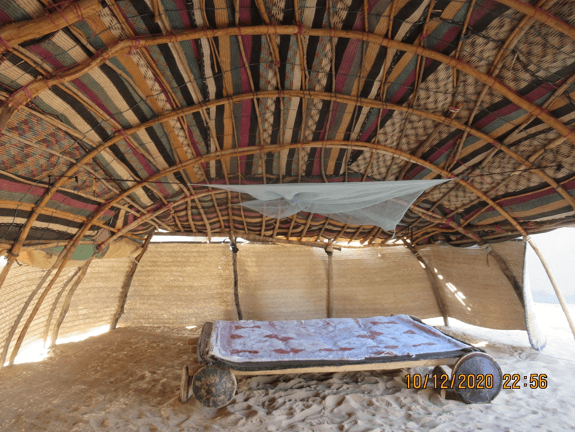 Mon lit sous la tente touarègue à Gadabedji, avec moustiquaire et comme tapis de sol le sable du désert.